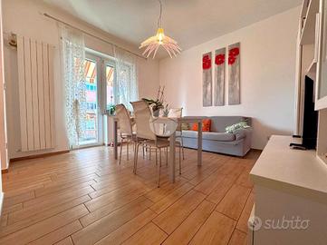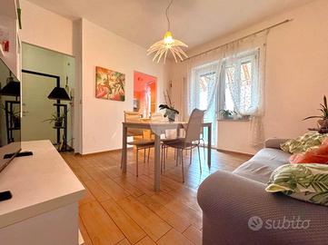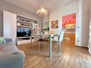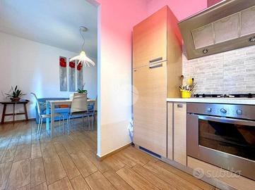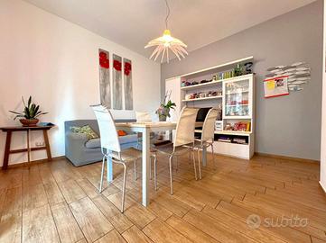 La zona giorno è composta da un tinello luminoso e da un cucinino di generose dimensioni, con accesso diretto a uno dei due balconi, ideale per pranzare all'aperto o rilassarsi durante le belle giornate. La pavimentazione lineare e uniforme in tutta la casa dona continuità e armonia agli spazi, creando un ambiente ordinato e accogliente.