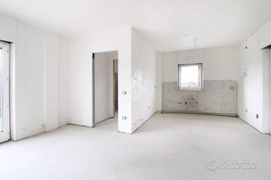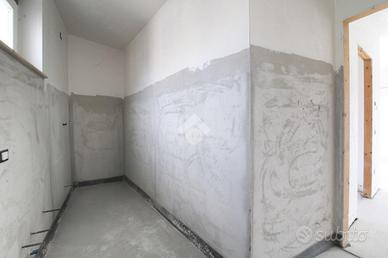 L'ingresso del secondo appartamento apre su un ampio soggiorno con accesso diretto sul terrazzo, cucina abitabile, o all'occorrenza terza camera da letto, e bagno finestrato.