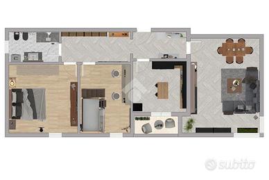 L'appartamento si presenta in condizioni originali, fatta eccezione per il bagno che è stato oggetto di completo rifacimento nel 2019. La pavimentazione è in marmo nel soggiorno e nel disimpegno, ceramica in cucina e parquet nella zona notte. In caso di ristrutturazione, l'appartamento presenta un grande potenziale dovuto all'ampiezza dei locali, alla sua grande luminosità ed alla vista che si gode da tutte le finestre.