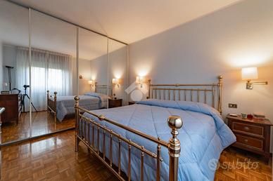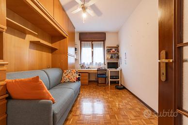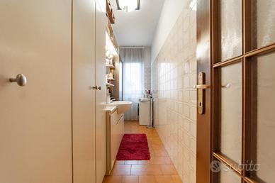 Posta al terzo piano con esposizione prevalente a nord-est, la soluzione da subito colpisce per la tranquillità della zona, sviluppandosi il condominio una traversa di una via laterale. L'ingresso avviene direttamente sul soggiorno, quadrato e di buone dimensioni, con finestra e porta finestra con accesso sul balcone incassato rispetto alla sagoma del palazzo e quindi coperto e ben sfruttabile. Anche la cucina, quadrata ed abitabile, presenta porta finestra doppia sul medesimo balcone. Un disimpegno sviluppato per tutta la lunghezza dell'unità immobiliare permette l'accesso alla zona notte composta da un primo bagno, finestrato con caina doccia, una spaziosa cameretta, camera matrimoniale di buone dimensioni ed un secondo bagno finestrato con vasca da bagno.