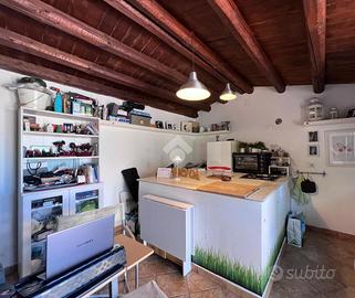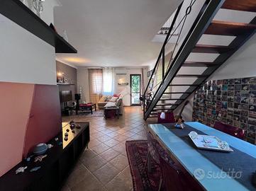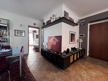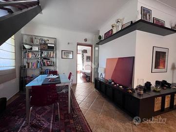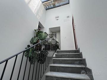 Una scala interna conduce al piano superiore dove si trova una cucina luminosa con accesso al terrazzo sovrastante, perfetto per cene all'aperto, momenti di relax o come spazio green in pieno centro città.