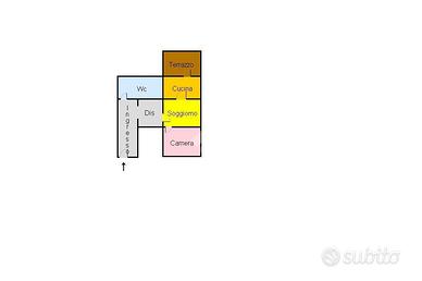 L'appartamento si sviluppa al piano terra con ingresso da portone. La disposizione interna comprende una camera, un soggiorno, una cucina abitabile e un servizio. Uno dei punti di forza della soluzione è certamente lo spazio esterno, accessibile direttamente dalla cucina: un ambiente prezioso, ideale per pranzi all'aperto, momenti di relax o per godersi la luce naturale durante tutta la giornata.