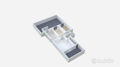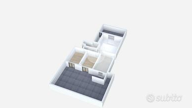 L'immobile si apre su un accogliente soggiorno, luminoso e ben proporzionato, con accesso diretto al primo spazio esterno privato, ideale per momenti di relax. Dal soggiorno, tramite un corridoio, si accede alla cucina abitabile, comoda e funzionale, dotata di servizio igienico con doccia e uscita sul secondo spazio esterno, riservato e versatile. La zona notte è composta da due camere da letto, un secondo servizio igienico.