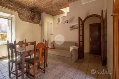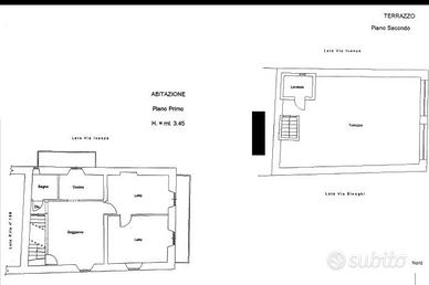 P1: composto da disimpegno, bagno con doccia, sala da pranzo, angolo cottura, disimpegno, 2 camere da letto, di cui una matrimoniale e l'altra singola. P2: tramite la scala si raggiunge la dominante terrazza.