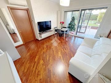La disposizione interna comprende una cucina separata, luminosa zona giorno con accesso diretto al giardino, due bagni, due camere da letto e impianti di ultima generzione, tra cui VMC per il controllo continuo dell'aria e tripli vetri per eccellente isolamento termoacustico.