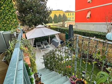 Elemento distintivo dell'abitazione è lo sfogo esterno: un ampio balcone, pavimentato con la stessa finitura interna per garantire continuità visiva, conduce tramite scala al giardino privato, ben curato e suddiviso tra zona pavimentata e area verde con piante. Il giardino offre inoltre più accessi, sia dalla passerella condominiale sia direttamente al vano autorimesse, permettendo anche un accesso indipendente.