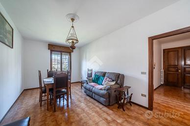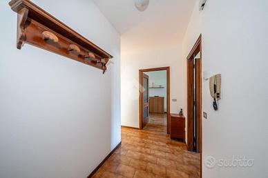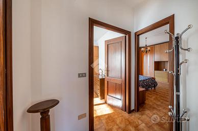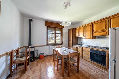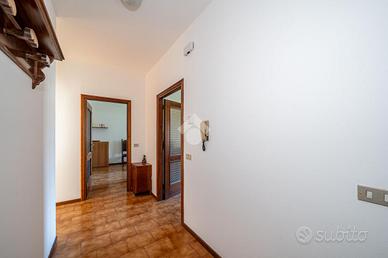 L'entrata dell' abitazione apre sul corridoio, oggi adibito ad ingresso, che separa la zona giorno, composta dalla cucina abitabile, dotata di canna fumaria, e dall'ampio e luminoso soggiorno.