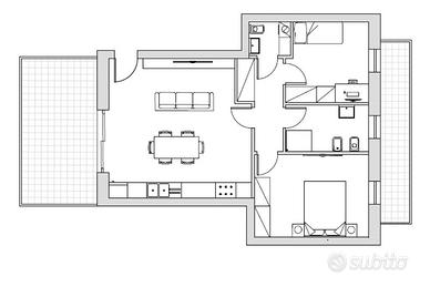 L'appartamento sorge al primo piano e si compone di una zona giorno con angolo cottura e accesso diretto ad un terrazzo coperto di circa 17mq, una camera matrimoniale con balcone, una camera singola con balcone, un bagno finestrato con doccia, un bagno cieco e un box auto doppio in larghezza.