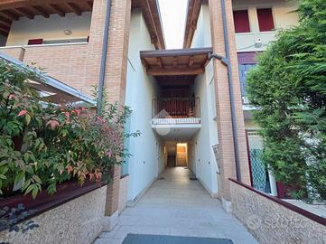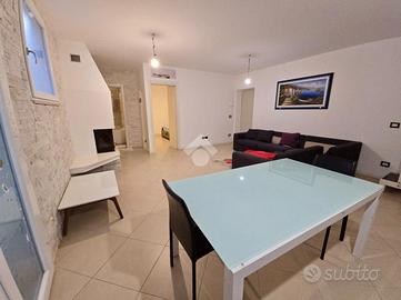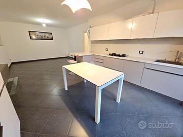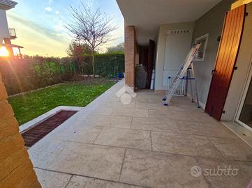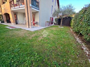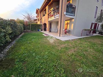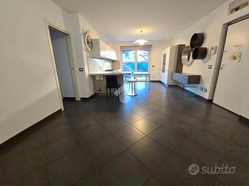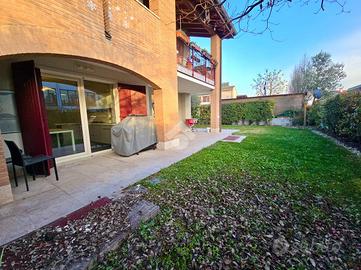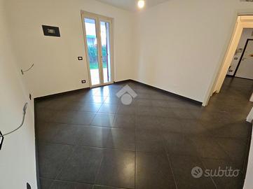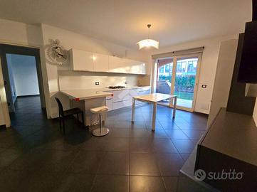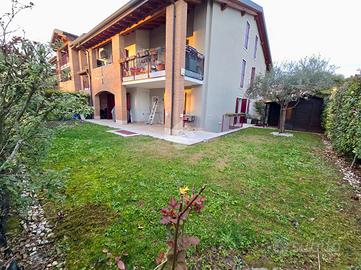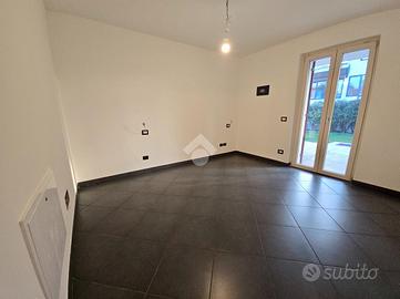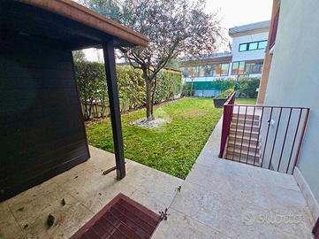 L'abitazione è suddivisa in un'ampia zona giorno che si affaccia sul porticato che conduce al giardino di circa 150 mq, una camera matrimoniale, una singola spaziosa ed un bagno finestrato con doccia.