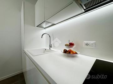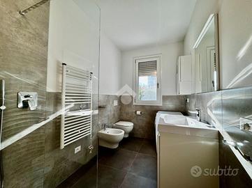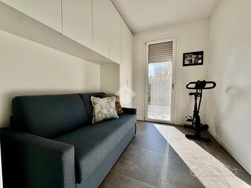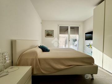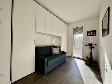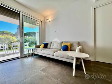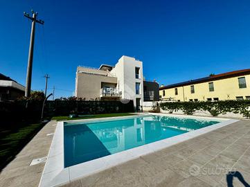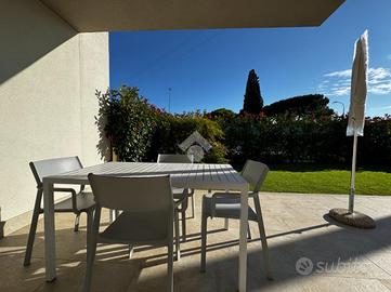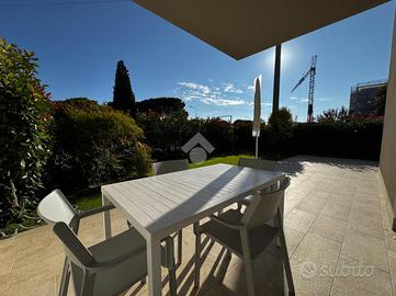 Peschiera del Garda - In nuovo contesto residenziale di sole otto unità, proponiamo in vendita un elegante appartamento trilocale arredato di cucina e bagno, posto al piano terreno con ampio giardino di proprietà e accesso diretto alla grande piscina condominiale. Questa nuova realizzazione, terminata nel 2023, si trova in posizione comoda e strategica per raggiungere le principali vie di comunicazione, proprio sul confine fra il centro abitato di Peschiera e la frazione San Benedetto di Lugana da dove si può arrivare tranquillamente a piedi in centro, al lago oppure alle attività commerciali più conosciute del luogo. La costruzione coniuga i più elevati standard tecnologici volti al risparmio energetico con un'ottima qualità dei materiali impiegati e delle finiture, il tutto per garantire un'eccellente qualità abitativa. L'appartamento, progettato in maniera sapiente e razionale, è composto da una luminosa zona giorno che si affaccia direttamente sul portico e sul giardino con una zona cottura e pranzo ben definita rispetto al soggiorno. La zona notte invece ospita una confortevole camera da letto matrimoniale, una seconda camera di buone dimensioni ed un bagno finestrato rifinito con sanitari e rubinetteria di ottima qualità. Completa la proprietà un'autorimessa con basculante motorizzata adeguata al ricovero di un'automobile di qualsiasi misura e, all'occorrenza, anche di scooter o biciclette. In considerazione della metratura del giardino, finito con erba sintetica di elevata qualità e con una rigogliosa siepe piantumata con diverse essenze, della posizione della residenza e del livello impiantistico e delle finiture, la proprietà è vocata sia all'impiego come residenza principale sia come seconda casa per le vacanze sia come investimento dal sicuro rendimento nel tempo.
