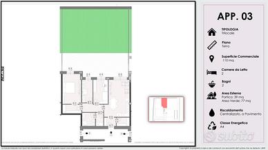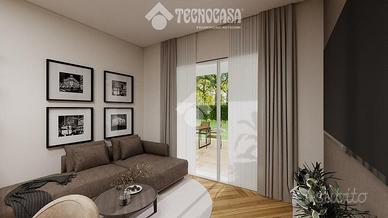 RESIDENZA GEMELLI In un contesto esclusivo e contemporaneo nasce Residenza Gemelli, un nuovo complesso residenziale composto da sole 15 abitazioni, progettate con elevati standard costruttivi, grande attenzione al risparmio energetico e una distribuzione degli spazi studiata per offrire il massimo comfort abitativo. Appartamento n. 3 - Piano Terra con giardino L'ingresso conduce a un comodo disimpegno che organizza in modo funzionale gli ambienti della casa. La zona living, ampia e luminosa, con cucina a vista, è valorizzata da un'ampia vetrata che garantisce grande luminosità naturale e crea una piacevole continuità tra interno ed esterno. Completa la zona giorno un pratico ripostiglio d'ingresso, ideale come locale cappottiera. Dalla zona giorno si accede direttamente all'esterno, dove si sviluppano un portico di circa 39 mq, perfetto per momenti di relax e pranzi all'aperto, e un giardino privato di circa 77 mq, ideale per vivere appieno gli spazi verdi in ogni stagione. La zona notte, accessibile dal soggiorno, è composta da due camere da letto, di cui una matrimoniale con cabina armadio, da un bagno padronale finestrato con doccia e da un bagno di servizio, anch'esso con doccia. Entrambe le camere godono di accesso diretto al giardino e risultano particolarmente luminose grazie alla doppia esposizione. Cantina compresa nel prezzo Possibilità di box auto, con metrature a partire da 25 mq fino a doppi box di circa 44 mq, a partire da € 30.000 DOTAZIONI E TECNOLOGIA Le abitazioni saranno realizzate con soluzioni moderne e tecnologicamente avanzate: * Riscaldamento centralizzato a pavimento * Predisposizione aria condizionata * Cappotto termico * Impianto VMC (Ventilazione Meccanica Controllata), per garantire un costante ricambio d'aria e un'elevata qualità abitativa * Tapparelle elettriche in alluminio coibentato * Serramenti in PVC * Predisposizione impianto di allarme * Impianto fotovoltaico * Sanitari sospesi * Ascensore * Po