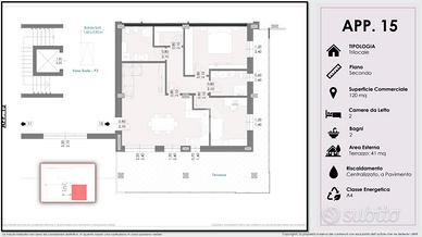 RESIDENZA GEMELLI In un contesto esclusivo e contemporaneo nasce Residenza Gemelli, un nuovo complesso residenziale composto da sole 15 abitazioni, progettate secondo elevati standard costruttivi, con grande attenzione al risparmio energetico e una distribuzione degli spazi studiata per offrire massimo comfort abitativo. Appartamento n. 15 Trilocale all'ultimo piano con ampio terrazzo L'ingresso conduce a una zona living ampia e luminosa, con cucina a vista, valorizzata da grandi vetrate che garantiscono un'eccellente illuminazione naturale e una piacevole continuità tra spazi interni ed esterni. La zona giorno si apre su un terrazzo coperto di circa 41 mq, ideale come area relax o per pranzi e cene all'aperto. Dal soggiorno si accede al disimpegno della zona notte, dove troviamo: * due camere da letto, di cui una matrimoniale * bagno padronale * bagno di servizio * comodo ripostiglio Anche le camere godono dell'accesso diretto al terrazzo, aumentando luminosità e vivibilità degli ambienti. Cantina compresa nel prezzo Possibilità di box auto, con metrature da 25 mq fino a doppi box di circa 44 mq, a partire da € 30.000 DOTAZIONI E TECNOLOGIA Le abitazioni saranno realizzate con soluzioni moderne e tecnologicamente avanzate, tra cui: * Riscaldamento centralizzato a pavimento * Predisposizione impianto di aria condizionata * Cappotto termico * Impianto di VMC - Ventilazione Meccanica Controllata, per un costante ricambio d'aria e un'elevata qualità abitativa * Tapparelle elettriche in alluminio coibentato * Serramenti in PVC * Predisposizione impianto di allarme * Impianto fotovoltaico * Sanitari sospesi * Ascensore * Ampia possibilità di personalizzazione del capitolato Le unità saranno realizzate in Classe Energetica A4, sinonimo di altissimo risparmio energetico, sostenibilità e comfort abitativo. IL CONTESTO Residenza Gemelli sorge in una zona tranquilla e immersa nel verde, ma allo stesso tempo strategica e ben collegata, comoda per il centro del paese, i pr...