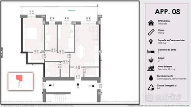 RESIDENZA GEMELLI In un contesto esclusivo e contemporaneo nasce Residenza Gemelli, un nuovo complesso residenziale composto da sole 15 abitazioni, progettate con elevati standard costruttivi, grande attenzione al risparmio energetico e una distribuzione degli spazi studiata per offrire il massimo comfort abitativo. Appartamento n. 8 - Primo Piano con terrazzo L'ingresso conduce a un comodo disimpegno che organizza in modo funzionale gli ambienti della casa. La zona living, ampia e luminosa, con cucina a vista, è valorizzata da una grande vetrata che garantisce un'eccellente luminosità naturale e crea una piacevole continuità tra interno ed esterno. Completa la zona giorno un pratico ripostiglio d'ingresso, ideale come locale cappottiera. Dalla zona giorno si accede direttamente all'esterno, dove si sviluppa un ampio terrazzo, perfetto per momenti di relax e pranzi all'aperto. Il terrazzo è accessibile sia dalla zona giorno che da entrambe le camere da letto, offrendo uno spazio esterno vivibile e fruibile in ogni momento della giornata. La zona notte, accessibile dal soggiorno, è composta da due camere da letto, di cui una matrimoniale con cabina armadio, da un bagno padronale finestrato con doccia e da un bagno di servizio, anch'esso con doccia. Entrambe le camere risultano particolarmente luminose grazie alla doppia esposizione e all'accesso diretto al terrazzo. Cantina compresa nel prezzo Possibilità di box auto, con metrature a partire da 25 mq fino a doppi box di circa 44 mq, a partire da € 30.000 DOTAZIONI E TECNOLOGIA Le abitazioni saranno realizzate con soluzioni moderne e tecnologicamente avanzate: * Riscaldamento centralizzato a pavimento * Predisposizione aria condizionata * Cappotto termico * Impianto VMC (Ventilazione Meccanica Controllata), per garantire un costante ricambio d'aria e un'elevata qualità abitativa * Tapparelle elettriche in alluminio coibentato * Serramenti in PVC * Predisposizione impianto di allarme * Impianto fotovoltaico * Sanita...