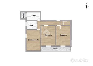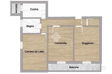 L'appartamento offre spazi ben distribuiti: entrando troviamo un ampio soggiorno e una cucina abitabile separata. La zona notte comprende una camera matrimoniale, una cameretta e un bagno con doccia. Un balcone, accessibile dal soggiorno, offre uno spazio esterno per godere di momenti all'aria aperta.
