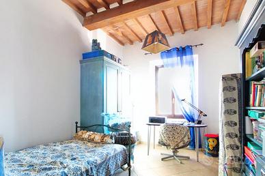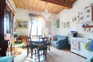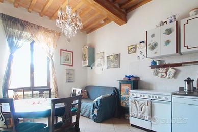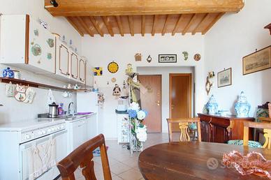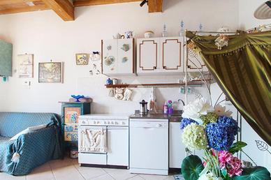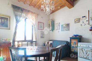 L'ingresso affaccia sulla luminosa zona giorno, dotata di soggiorno con angolo cottura, e caratterizzata dal soffitto con travi a vista.