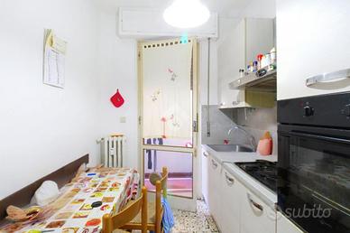 L'ingresso si apre su un pratico disimpegno che conduce alla zona giorno, composta da un cucinotto con accesso al balcone -- dove si trova anche un comodo ripostiglio -- e alla zona notte, formata da due camere da letto e un bagno finestrato completo di box doccia.