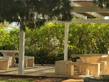 Il residence è dotato di due piscine, una pineta con area relax e un campo da tennis, offrendo molteplici opzioni per il tempo libero.