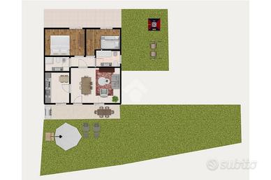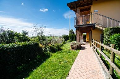 All'esterno, un soleggiato portico si affaccia sul giardino, perfetto per pranzi all'aperto e momenti di relax. Sul lato delle camere, un secondo giardino con portico aggiunge ulteriore comfort e riservatezza.