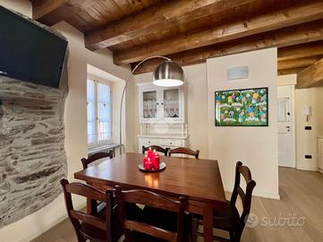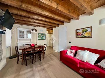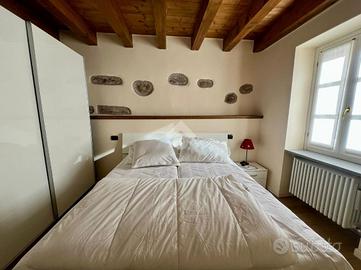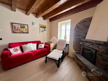 All'ingresso della soluzione ci accoglie la zona giorno completa di camino a legna e cucina a 'vista' sul luminoso soggiorno con accesso al balcone con vista panoramica sulle montagne.