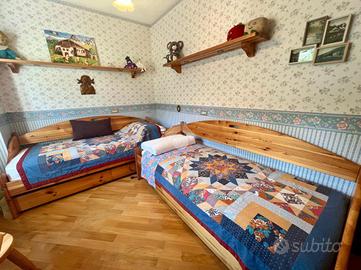Tramite la scala interna raggiungiamo il piano primo così composto: bagno con doccia, zona giorno con cucina e attraverso il disimpegno troviamo la zona notte con camera matrimoniale e cameretta.
