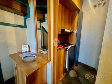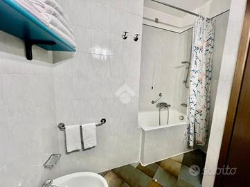All'ingresso della soluzione troviamo l'antibagno e il bagno con vasca. Proseguendo raggiungiamo la zona giorno con cucina a 'vista', accesso al balcone e la prima cameretta singola.