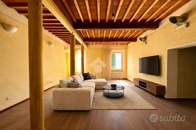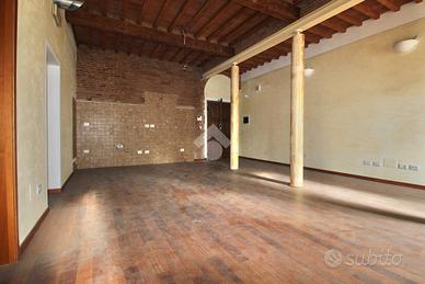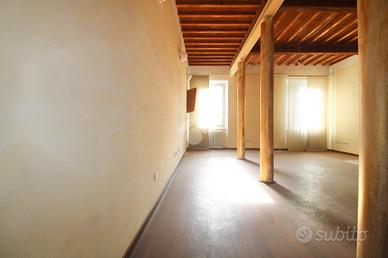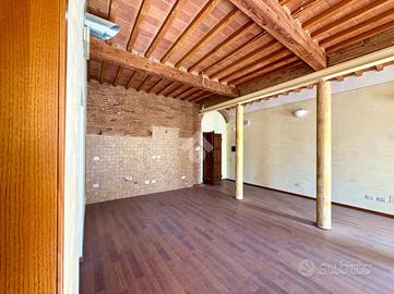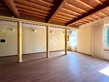 PONTEDERA -CENTRO Nel cuore del centro storico di Pontedera, all'interno di un elegante palazzo d'epoca ben tenuto e servito da ascensore, proponiamo in vendita affascinante appartamento posto al secondo piano. L'immobile si distingue per il suo carattere unico e per gli ambienti ampi e luminosi. L'ingresso si apre su una splendida zona giorno open space di grande metratura, impreziosita da soffitti alti con travi e mezzane a vista e suggestivi dettagli in mattoni, che conferiscono calore e autenticità agli spazi. La presenza di colonne decorative rende l'ambiente ancora più scenografico e ideale per soluzioni di arredo moderne o di design. La zona living è predisposta per cucina a vista e offre molteplici possibilità di personalizzazione. Tramite un comodo disimpegno accediamo alla zona notte composta da due camere ben proporzionate, caratterizzate da pavimenti in parquet e buona luminosità naturale. Completano la proprietà il bagno dotato di box doccia e gli spazi accessori. L'appartamento necessita di alcuni interventi di personalizzazione, offrendo così l'opportunità di creare una soluzione abitativa su misura, mantenendo il fascino dello stile toscano. Soluzione ideale per chi desidera vivere nel centro storico, con tutti i servizi a portata di mano, senza rinunciare a spazi ampi e ad un contesto di pregio.