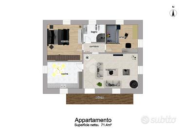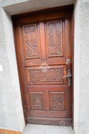 L'appartamento è situato al primo piano di una palazzina di sole tre unità abitative ed dotato di accesso indipendente dal terrazzino e scala privati. L'ingresso è caratterizzato dal portoncino in legno scolpito con immagini e panorami valdostani. Esso apre su un disimpegno aperto sul soggiorno e diviso solo da un muretto basso.
