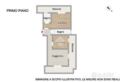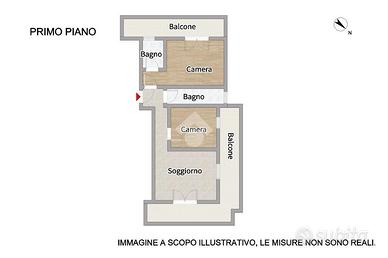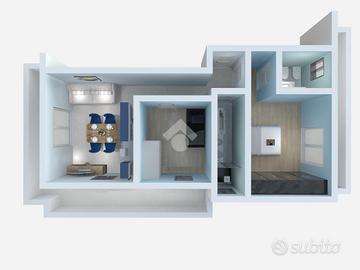 L'ingresso si apre sulla luminosa zona giorno con angolo cottura, dalla quale si accede al balcone con vista. Un comodo disimpegno conduce alla zona notte, composta da una spaziosa camera matrimoniale con affaccio sul balcone, una seconda camera e due bagni, di cui uno riservato alla camera padronale.