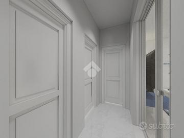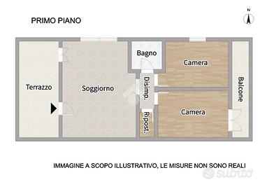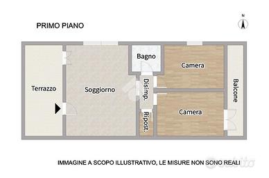 L'ingresso si apre sulla luminosa zona giorno con angolo cottura, dalla quale si accede al balcone. Un comodo disimpegno conduce alla zona notte, composta da due spaziose camere matrimoniali ed il bagno con doccia.
