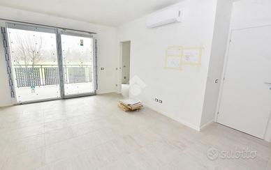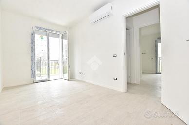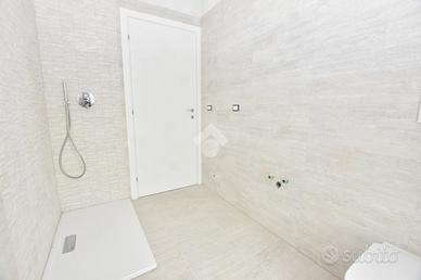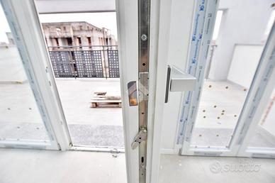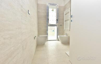 L'appartamento è così composto: ingresso in disimpegno, primo servizio cieco con la doccia, zona giorno con sala da pranzo ed uscita sul terrazzo privato, cucina abitabile e due camere matrimoniali divise dal secondo servizio finestrato con la vasca/doccia.