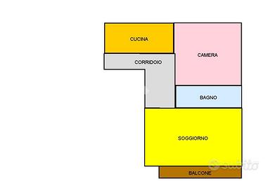L'ingresso all'appartamento avviene direttamente sulla cucina abitabile dotata di finestre. Un corridoio separa la camera da letto matrimoniale dotata di finestra dal bagno e dal soggiorno, quest'ultimo è reso luminoso grazie alla presenza di una porta finestra con uscita sul balcone. Infine il bagno è dotato di vasca e finestra.