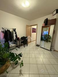 L'ingresso conduce direttamente nella zona giorno, dove il soggiorno con cucina a vista crea un ambiente luminoso e funzionale.