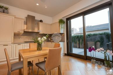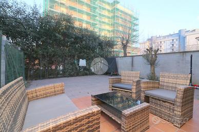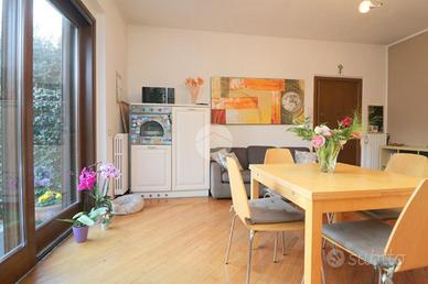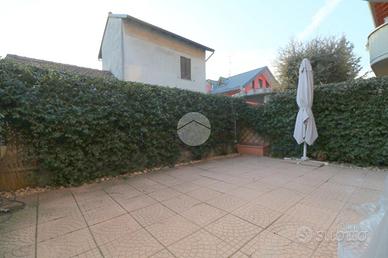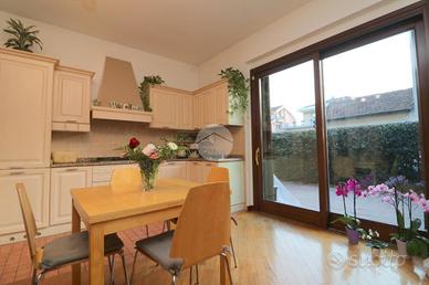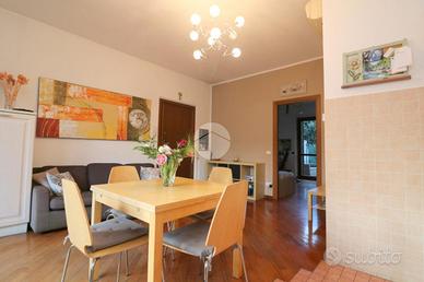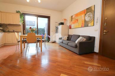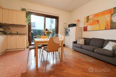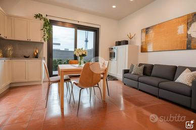 L'ingresso si apre sulla zona living con cucina a vista resa molto luminosa grazie ad una doppia finestra che guarda direttamente sul giardino privato. Un angolo perfetto per rilassarsi o organizzare una cena all'aperto. Le due camere da letto sono entrambe spaziose e luminose, una delle quali ha una porta finestra che conduce sull'altro lato del giardino, anche questo piastrellato, per avere sempre un angolo dove potersi rilassare.