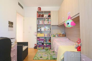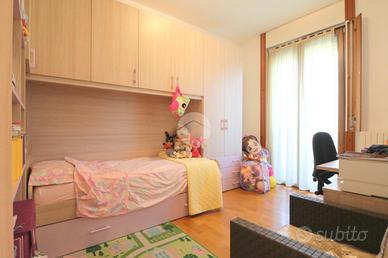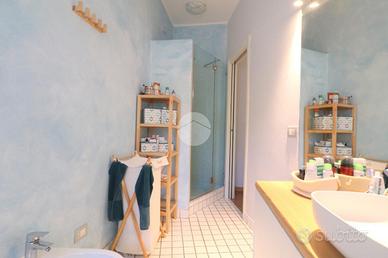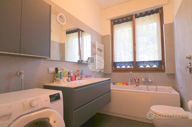 Un disimpegno collega alla zona notte, dove troviamo un pratico ripostiglio con attacco per la lavatrice, un bagno finestrato con vasca e due camere da letto. Una delle camere è dotata di bagno privato, anch'esso finestrato e con doccia.
