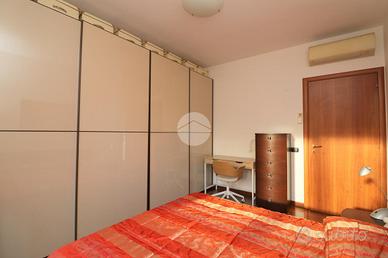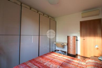 La zona notte è separata da una porta scorrevole con finiture in vetro di Murano, dettaglio di pregio che valorizza l'ambiente.