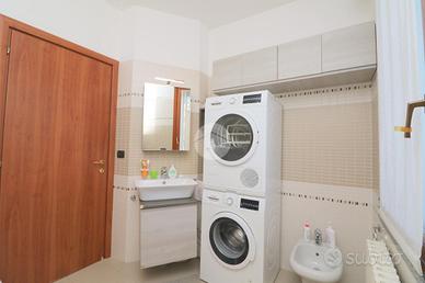La cucina, pavimentata in gres e arredata su due lati, risulta comoda e funzionale, con accesso diretto allo spazio esterno. Nel soggiorno inoltre e' stato ricavato un angolo smart working, reso particolarmente luminoso grazie alle due finestre.
