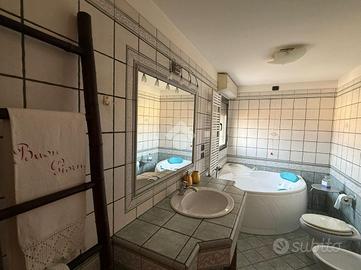 Al livello superiore, accessibile sia tramite un ingresso indipendente servito da ascensore, sia da scala interna, si trovano due camere da letto matrimoniali con entrambe terrazzo privato, una terza cucina e un bagno finestrato con idromassaggio, garantendo privacy e comodità.