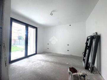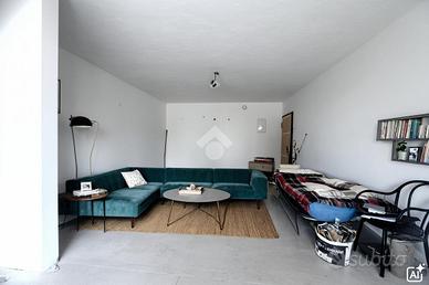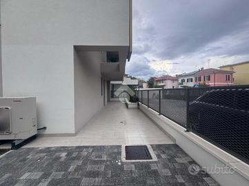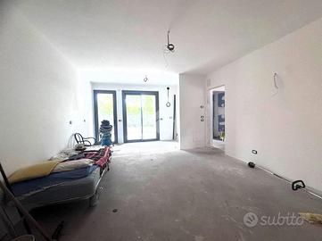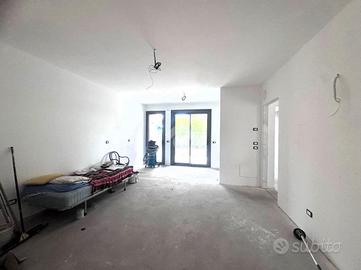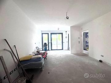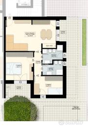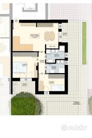 L'immobile è così suddiviso; ingresso su ampio salone con cucina a vista che affaccia su comodo corte di 90 mq di cui una parte loggiata, nella zona notte abbiamo due camere da letto e due bagni tutti e due finestrati con box doccia.