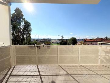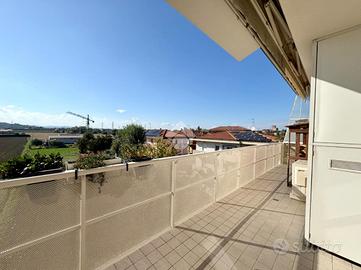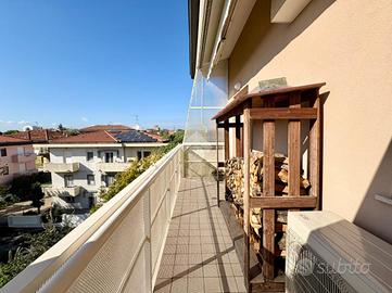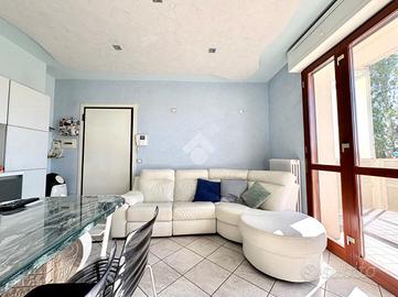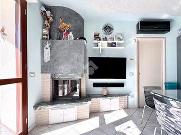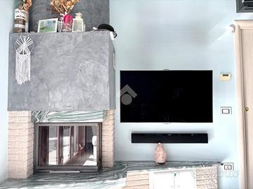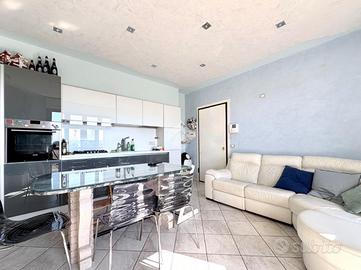 L'ingresso si apre su un ampio soggiorno con angolo cottura, impreziosito da un termocamino in vetro e marmo che dona calore e stile all'ambiente. Dal soggiorno si accede direttamente al balcone, dotato sia di tende da sole estive che di tende invernali motorizzate, perfette per garantire comfort in ogni stagione, e dal quale si gode di una bella vista aperta.