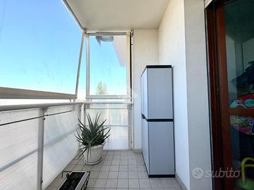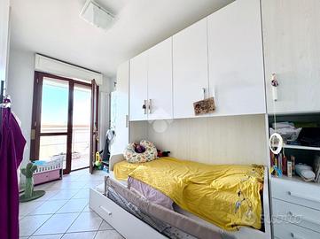 La zona notte, separata da un disimpegno, comprende un bagno finestrato con box doccia, rifinito con materiali di alta qualità, una spaziosa camera matrimoniale con accesso al balcone e una camera doppia con balcone privato.