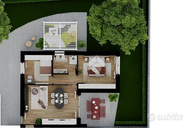 Trilocale di nuova costruzione in classe energetica A4 di 90 mq commerciali situato al piano terra con ampio giardino. L'accesso è diretto sulla zona living open space, composta da zona dining e zona soggiorno. Da qui si accede da una parte al giardino tramite una comoda porta finestra, dall'altra al meraviglioso patio, perfetto per momenti di convivialità e relax.