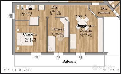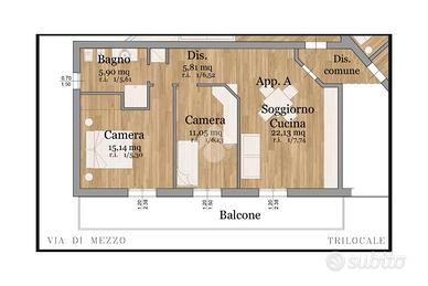 Entrando troviamo una luminosa zona giorno con angolo cottura e soggiorno, proseguendo per il disimpegno si accede alla zona notte, composta da due camere matrimoniali balconate e per finire abbiamo un bagno finestrato con box doccia e zona lavanderia.