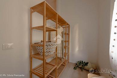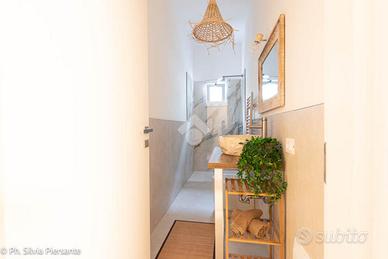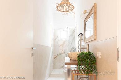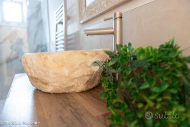 Il corridoio, con le sue tonalità calde, guida verso la zona notte. La prima porta conduce alla cameretta, perfetta come stanza per i ragazzi, studio creativo o camera degli ospit i.Proseguendo, si incontra un bagno luminoso, impreziosito da finiture pregiate, con lavabo in marmo di Bali e richiami agli elementi naturali tipici di quelle terre lontane: un ambiente che diventa ogni giorno un'oasi di benessere.