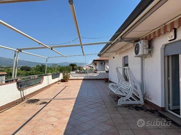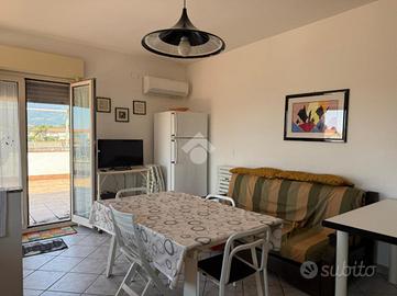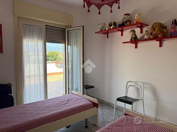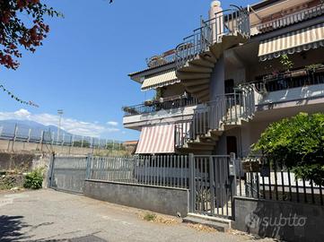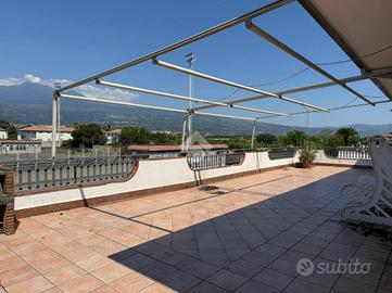 L'appartamento: al secondo piano, ingresso indipendente da scala esterna a chiocciola al balcone esposto a Sud ed al terrazzo, con accesso diretto sulla cucina-soggiorno, un disimpegno divide i vani dell'immobile: due le camere da letto ed il bagno. Tutti gli ambienti di casa hanno affaccio sul terrazzo a livello panoramico da cui si può godere la vista sull'Etna, con zona barbecue e tenda da sole in ottime condizioni. L'immobile si presenta luminoso ed arioso, grazie anche ai due balconi esposti a Nord e Sud, di cui uno verandato ed adibito a lavanderia. Le condizioni interne sono ottime, gli infissi in alluminio doppiovetro con zanzariere, l'impianto elettrico ed idrico sono allo stato originario.