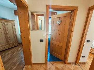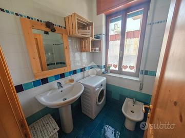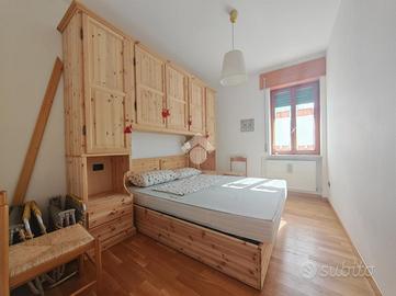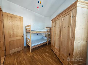 Un piccolo disimpegno separa la zona giorno dalla spaziosa camera matrimoniale, dalla camera doppia con letti a castello e dal bagno finestrato con box doccia.
