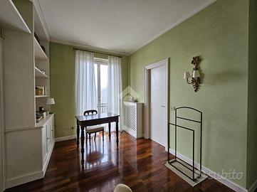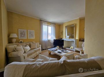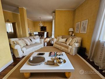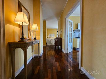 * Pavimentazione: Parquet di legno pregiato in tutto l'appartamento, mentre il primo bagno è rifinito in travertino e il secondo in marmo di Carrara.
