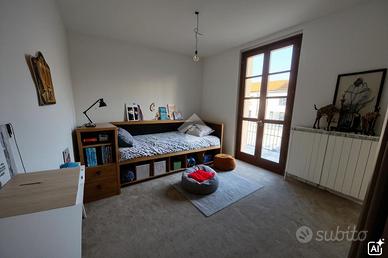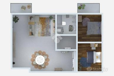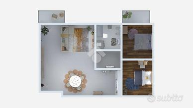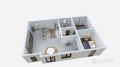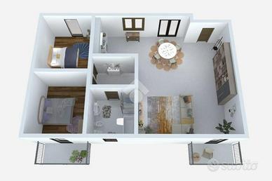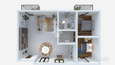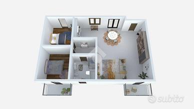 L'appartamento è così composto: ingresso direttamente nel soggiorno con cucina a vista ed il primo balcone. Proseguendo nel piccolo disimpegno, veniamo accolti nella zona notte composta da bagno finestrato con box doccia e vasca e alle due camere; la prima matrimoniale con il secondo balcone e la seconda, la cameretta, con accesso diretto al ballatoio.