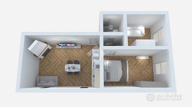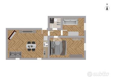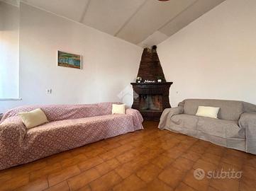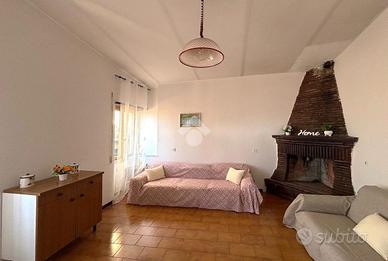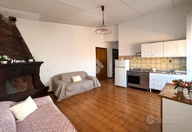 Attraversando la prima porta condominiale e salendo le scale arriviamo al portoncino d'ingresso, dove ad accoglierci troviamo il comodo soggiorno con angolo cottura, caratterizzato da un camino a legna funzionante e dotato di due finestre che permettono di avere un ambiente luminoso e arieggiato.