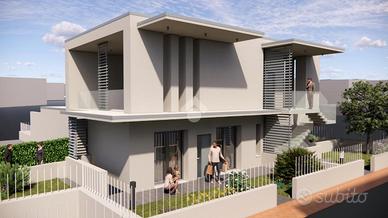 L'unità immobiliare prevede una distribuzione degli spazi interni intelligente e funzionale. L'ingresso pedonale di proprietà conduce al portico, dal quale si ha accesso alla zona giorno: un open space di 44 mq che beneficia della luce naturale per tutta la giornata, grazie all'esposizione a sud ovest. Frontalmente alla porta d'ingresso si trova una comoda lavanderia finestrata dotata di bagno. Nella zona notte sono presenti due camere da letto, una matrimoniale di 15 mq e una doppia di 12 mq, ed un secondo bagno finestrato. Il giardino, che si estende attorno all'abitazione per un totale di 150 mq, gode di un'esposizione solare costante. Dalla scala esterna privata e coperta si accede all'interrato, dove trova spazio una pratica autorimessa doppia in larghezza.