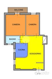 All'ingresso troviamo una zona living accogliente, collegata alla cucina tramite un comodo passavivande. Un disimpegno separa la zona giorno dalla zona notte, composta da due camere da letto (una con accesso al balcone) e un bagno finestrato.
